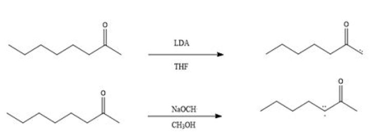 Strong organic bases such as LDA (Lithium DiisopropylAmide) can be used to drive the ketone-enolate equilibrium completely to the enolate side. LDA is a strong base that is useful for this purpose. The steric bulk of its isopropyl groups makes LDA non- nucleophilic.