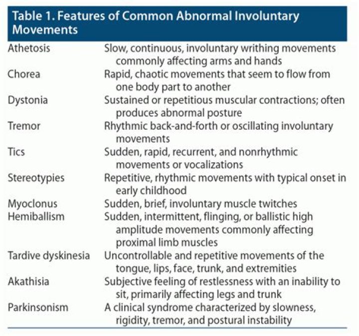 Involuntary movements compose a group of uncontrolled movements that may manifest as a tremor, tic, myoclonic jerk, chorea, athetosis, dystonia or hemiballism.