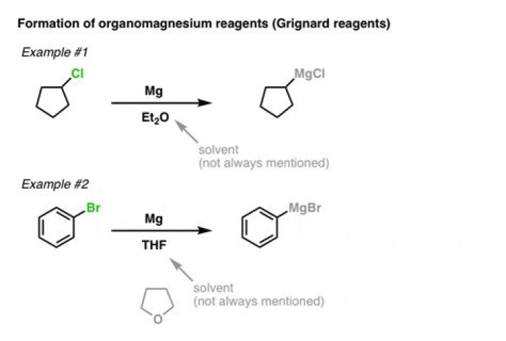 Explanation: A Grignard reaction involves the reaction of an alkyl (or aryl halide) with magnesium metal to form an alkylmagnesium halide. Diethyl ether is an especially good solvent for the formation of Grignard reagents